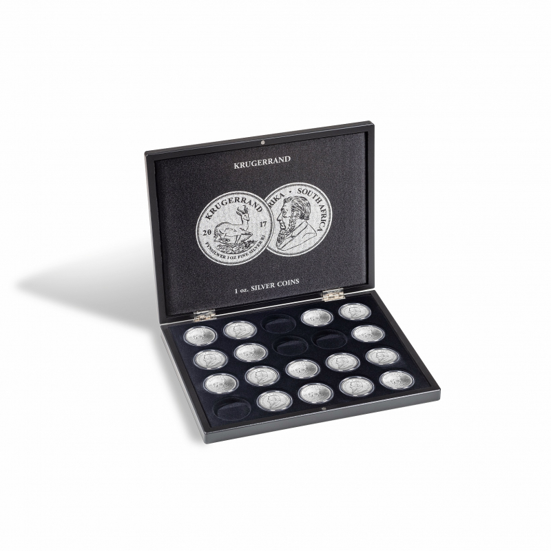 Элегантный черный презентационный футляр для 20 серебряных монет "Южная Африка Крюгерранд" (1 унция) в капсулах.